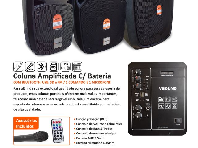 - Colunas: 2x 10" (Woofer), 1x 1" (Tweeter)